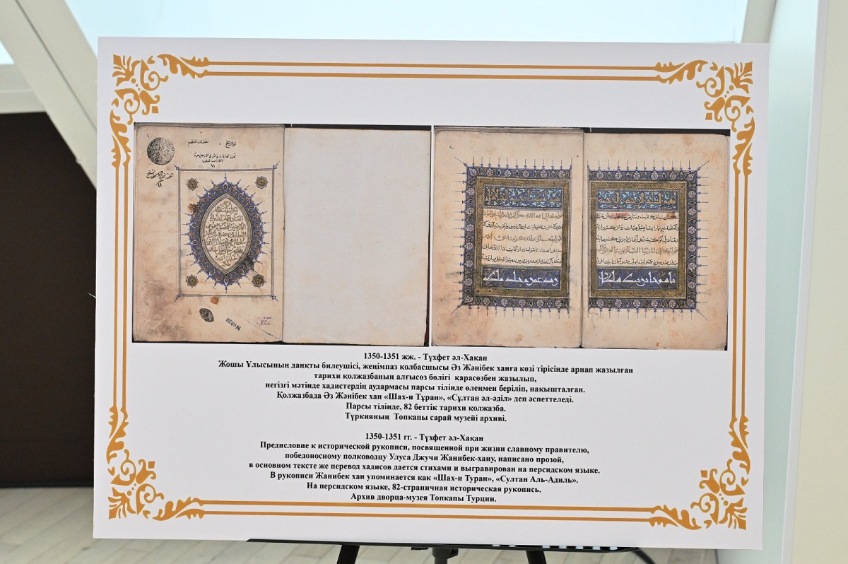 В рамках конференции также открылась выставка ценных архивных материалов, возвращенных в страну из стран ближнего и дальнего зарубежья. Среди них – исторические записи о Жанибек-хане, привезенные из музея Топкапы (Турция); обнаруженная в архивах Тайваня карта Тартарии за 1641 год, на которой обозначены Казахское ханство и Ногайская орда, а также города Сарайшык, Туркестан, Тараз, Жент; исторические сведения о Султане Бейбарысе, найденные в Египте; архивные записи о быте и укладе казахов в XIX–XX веках, привезенные из архивов Германии и Монголии; данные из архивов Беларуси о снайпере Жумане Есиркееве, воевавшем на 3-м Белорусском фронте, и другие редкие и ценные документы.