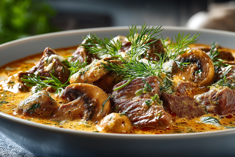 Говядина (лопатка или вырезка) — 500 г, луковица (крупная), чеснок — 2 зубчика, шампиньоны — 200 г, томатная паста — 1 ст. л., сметана (20%) — 150 г, бульон говяжий (или куриный) — 100 мл, масло растительное — 2 ч. л., паприка молотая — 1 ч. л., петрушка свежая — небольшой пучок, соль, перец чёрный молотый — по вкусу.
